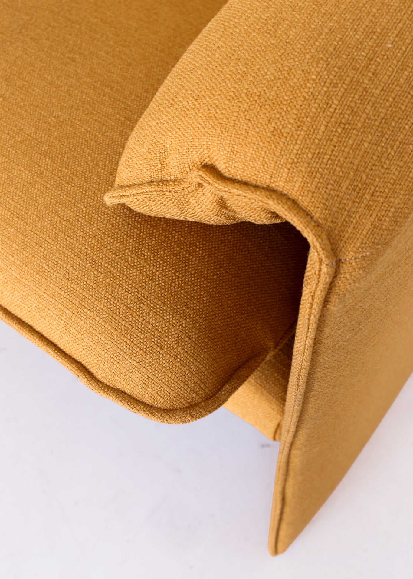 Condition: Very good. Restored and re-upholstered with a deep mustard yellow linen-like weave.