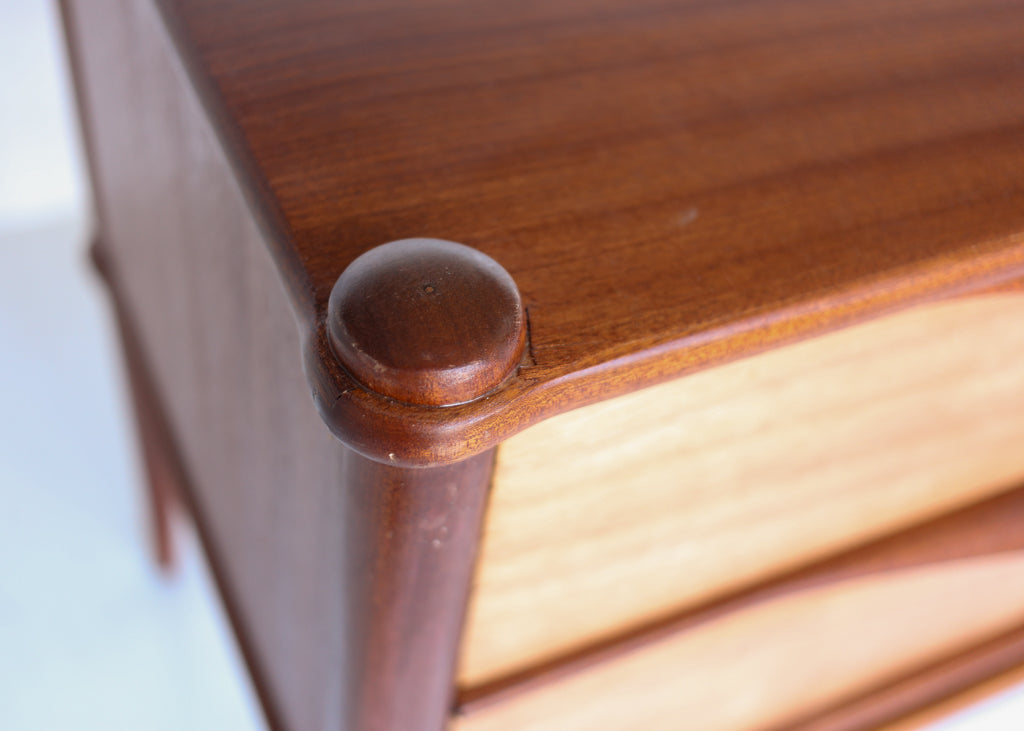 A small and elegant mid-century modern sideboard made from birch and sapele wood, sitting on an elevated base. The four side drawers have sculpted handles, the three drawers in the middle have integrated handles.