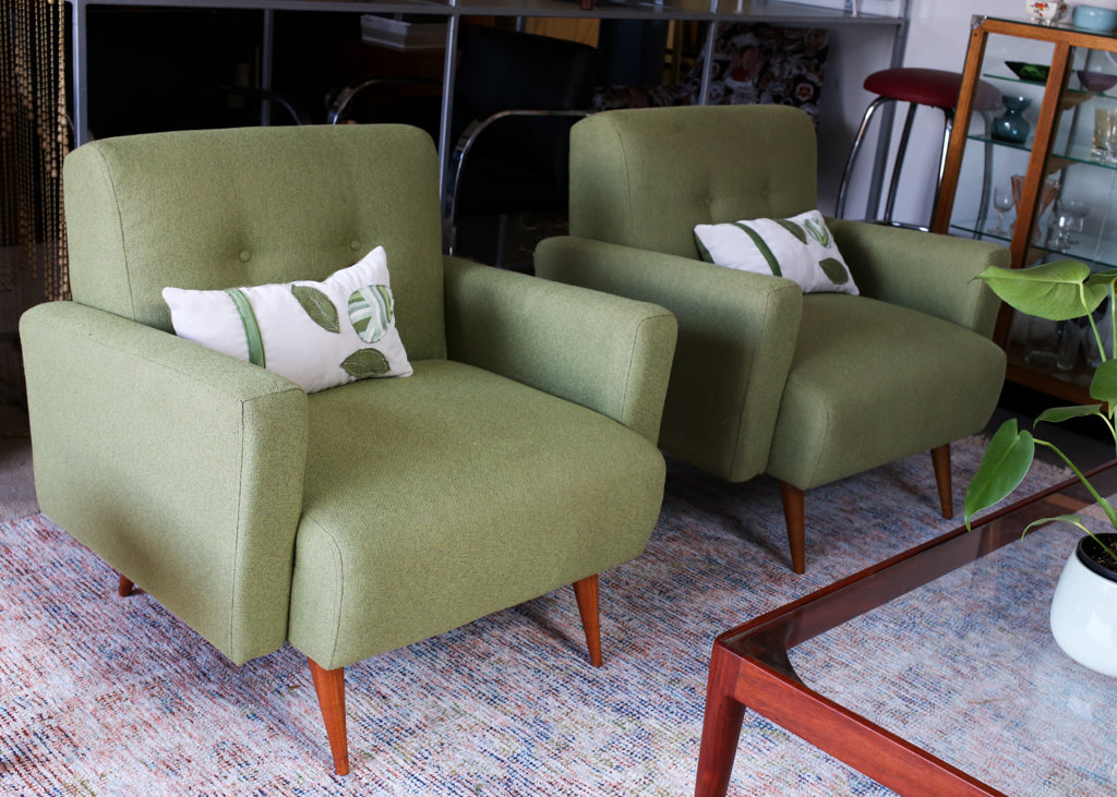 The upholstery is a smooth, avocado green weave.