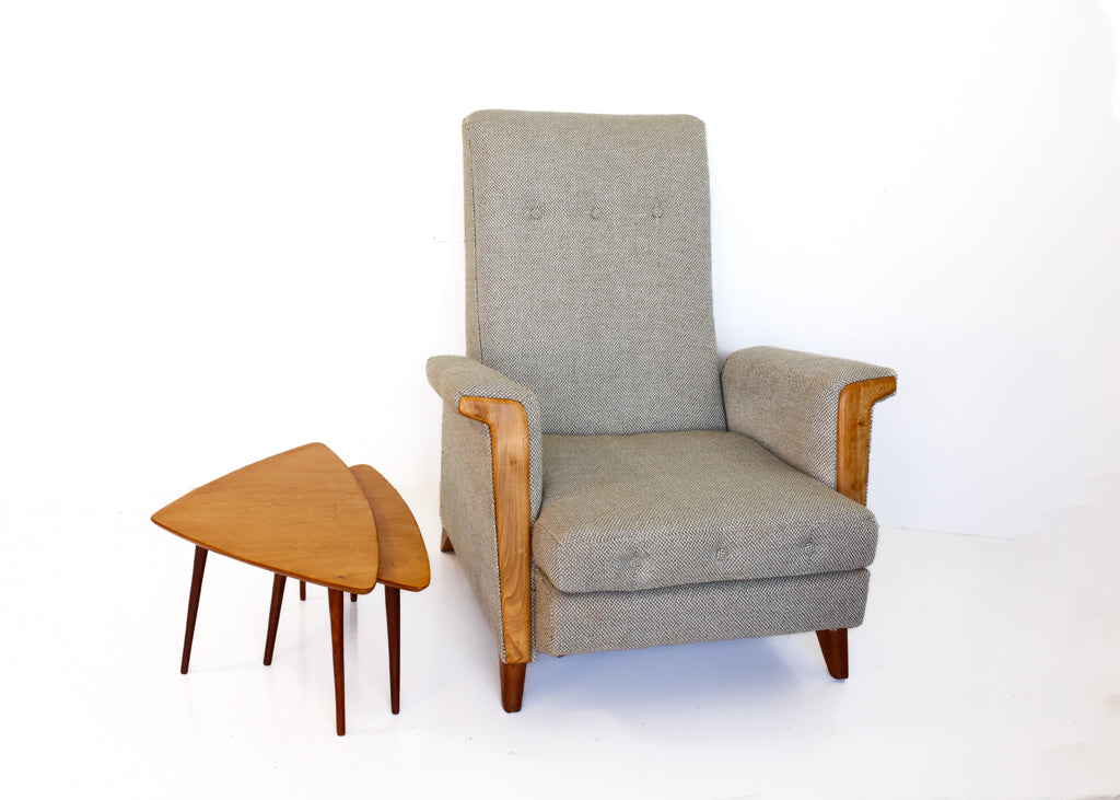 An exquisite, 1960's Parker Knoll armchair that marries British sensibility with Scandinavian flair. It has a high back and is recovered in a stone and olive weave. The seat and back features button detail and the front of the armrests are wood clad. It is a low seat, and very comfortable.