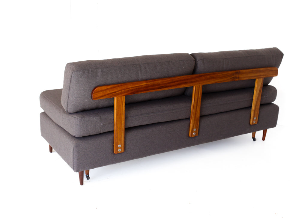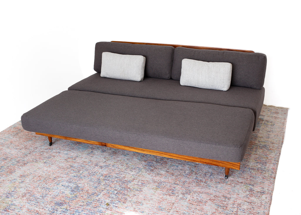 A mid-century modern style sleeper sofa with a pull-out section and two mattresses that create a 144 cm wide bed. Two wide back cushions rests against a solid Rhodesian teak frame. The legs and detail in front are the same wood.