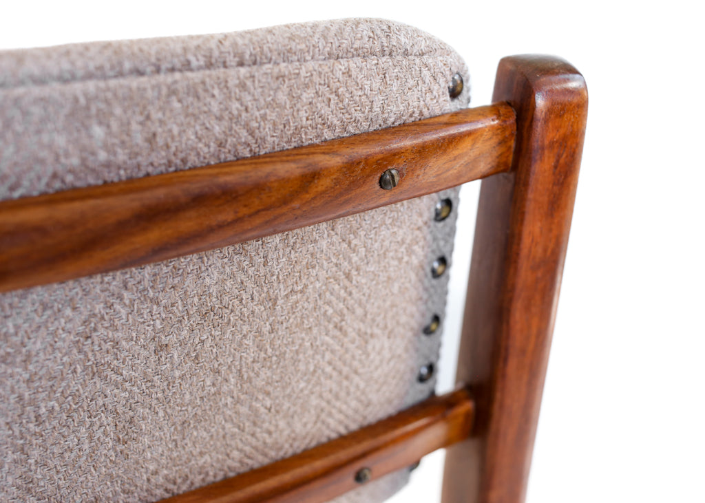 Six mid-century modern kiaat dining chairs with seats and backs newly covered in a biscuit weave. The set was made by legendary South African mid-century company, Novocraft, that was based in Germiston near Johannesburg. The frames, that used to be stained dark brown, were sanded and refinished with a clear varnish to celebrate the natural colour of the wood.