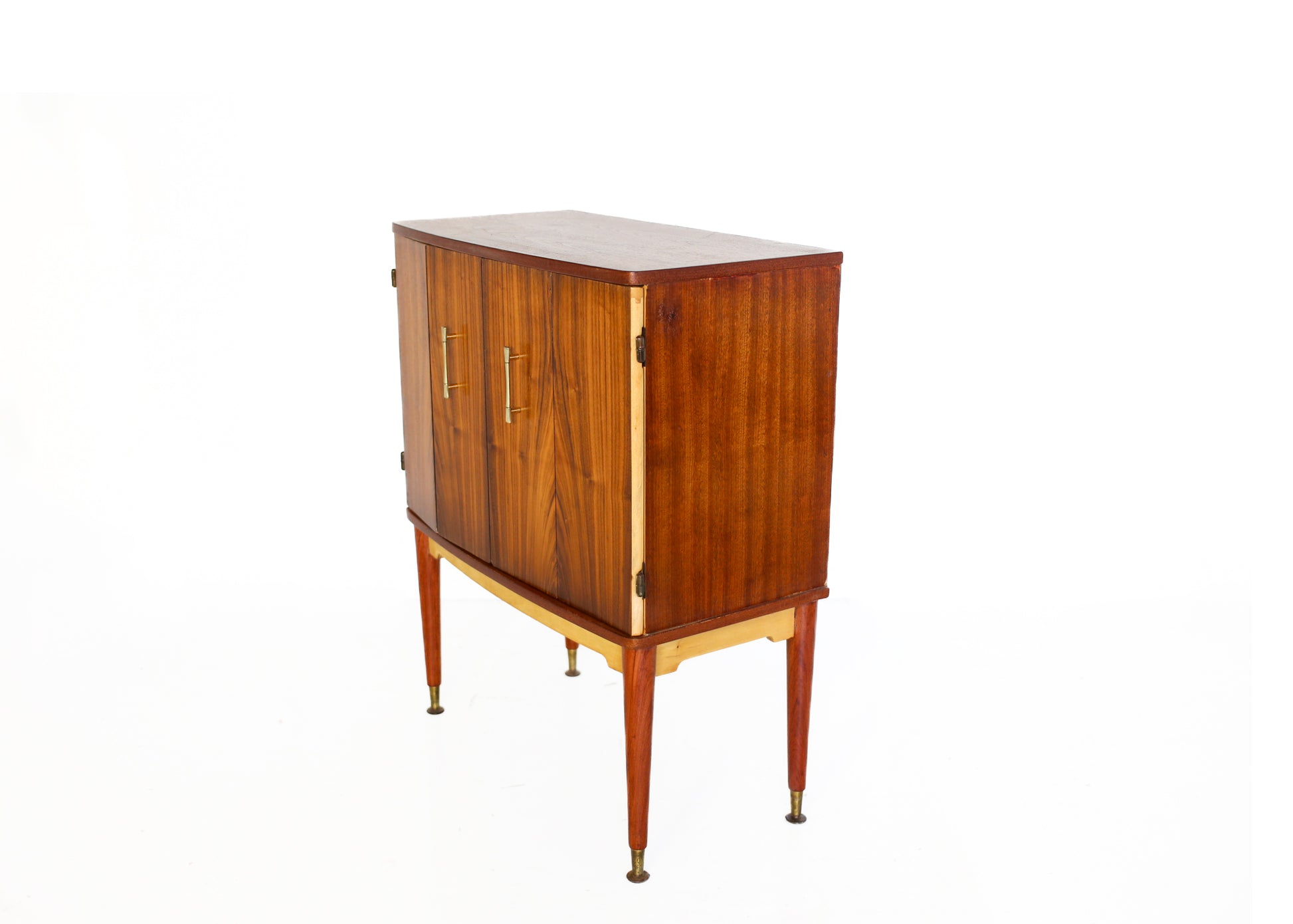A cabinet in typical mid-century style, originally made for a box television. It used to have an open back, we closed it with a ply wood back board and a placed a single shelf inside. It has two bi-fold doors with two panels each, joined with hinges in the middle.
