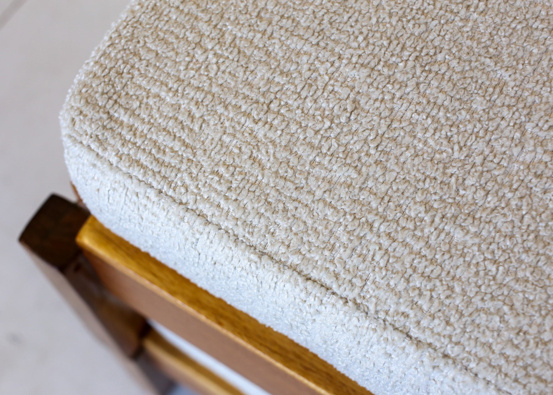 Two vintage stacking chairs or footstools with new cushions, covered with a cream bouclé type fabric.