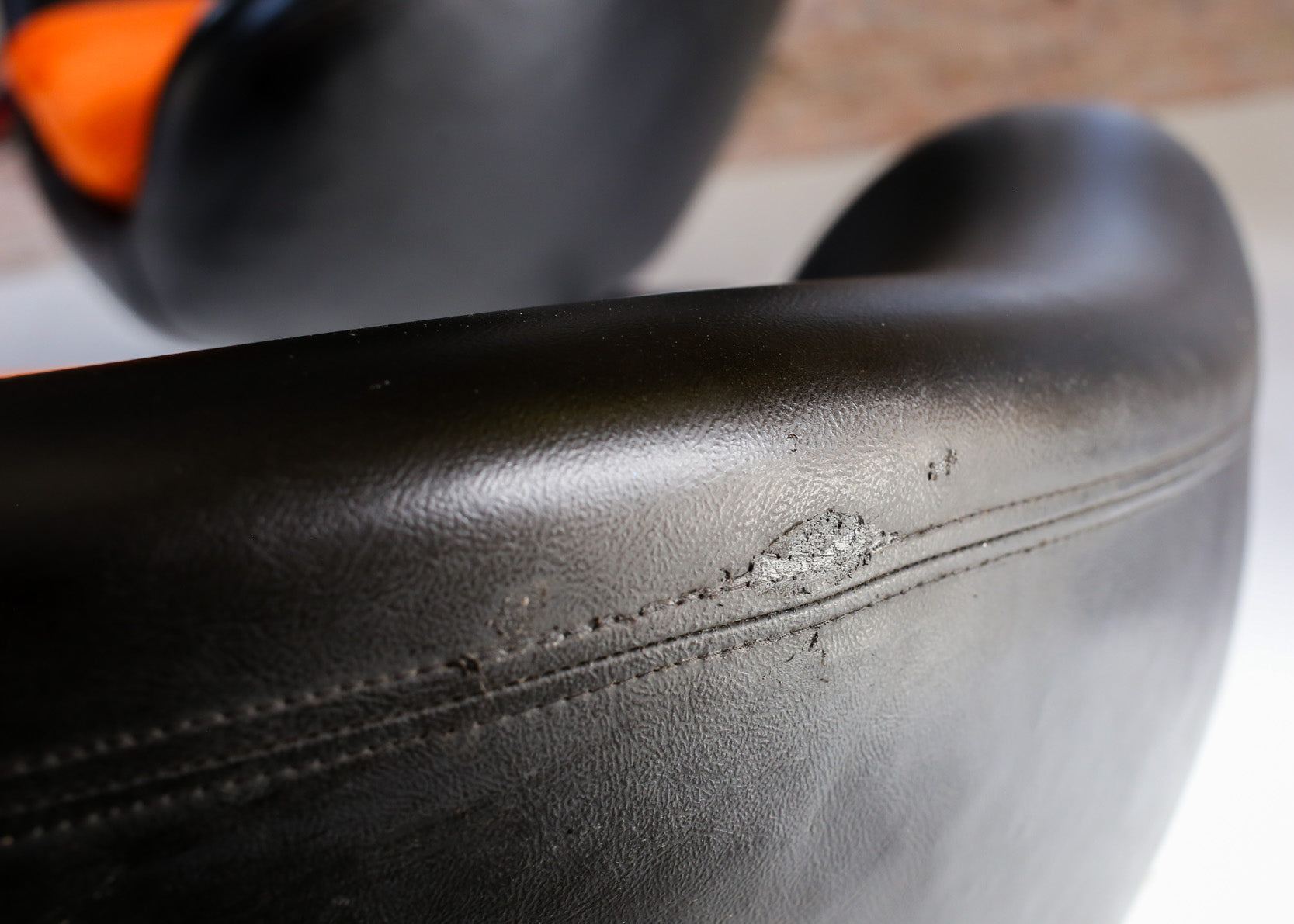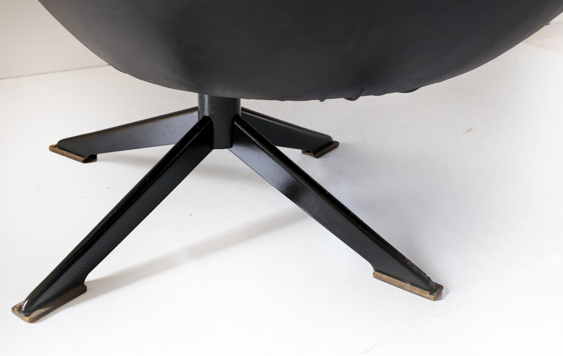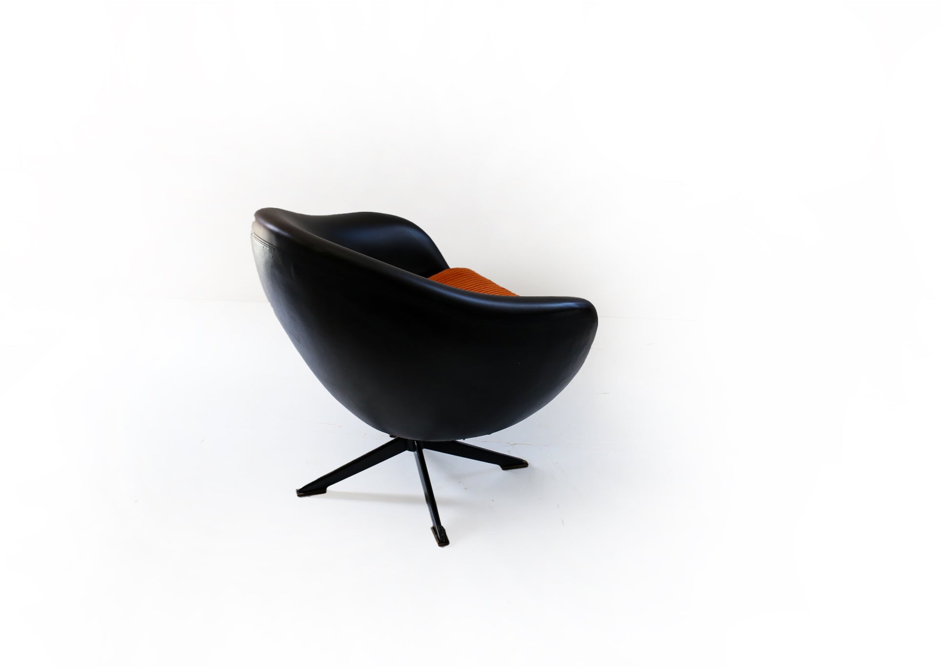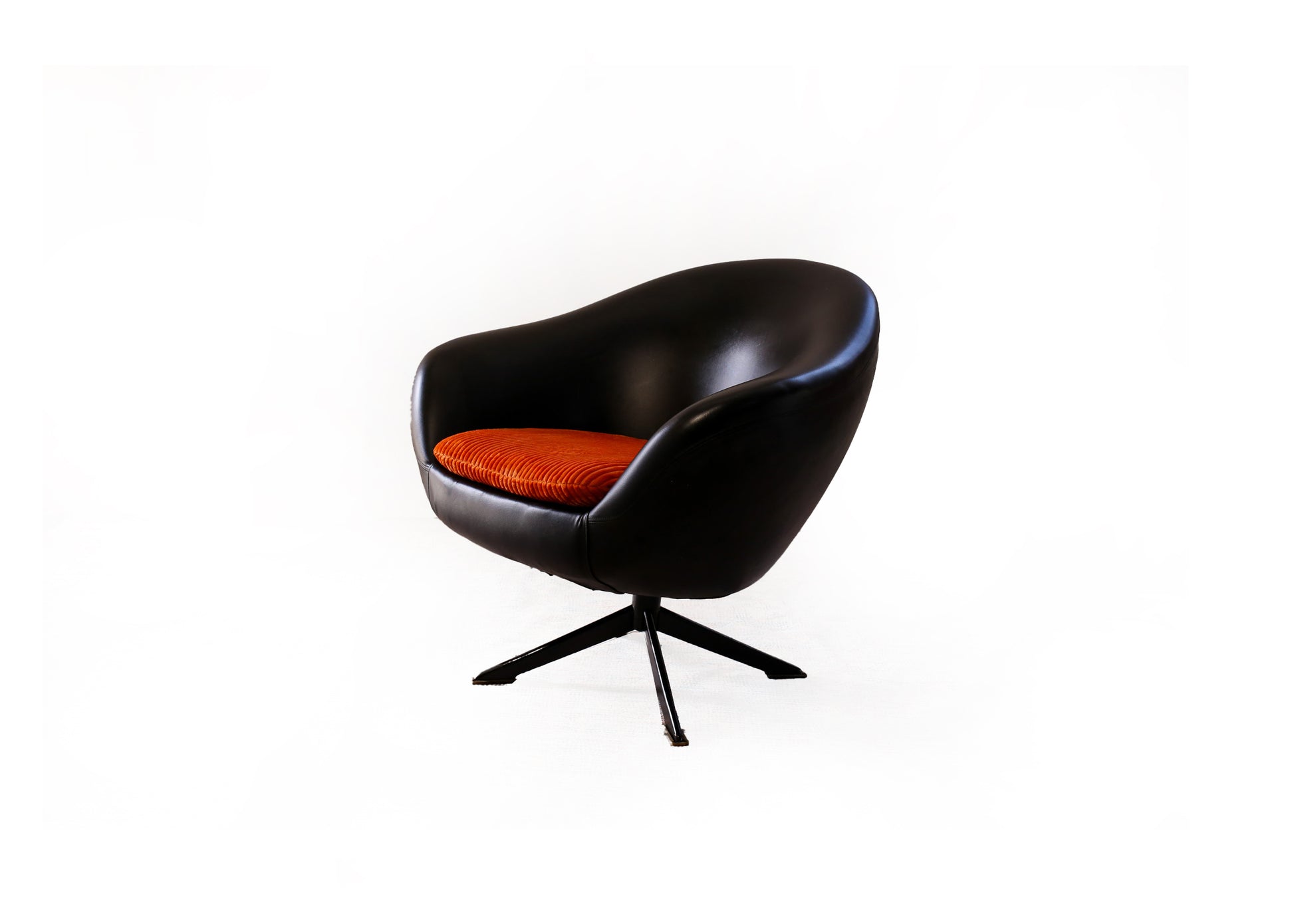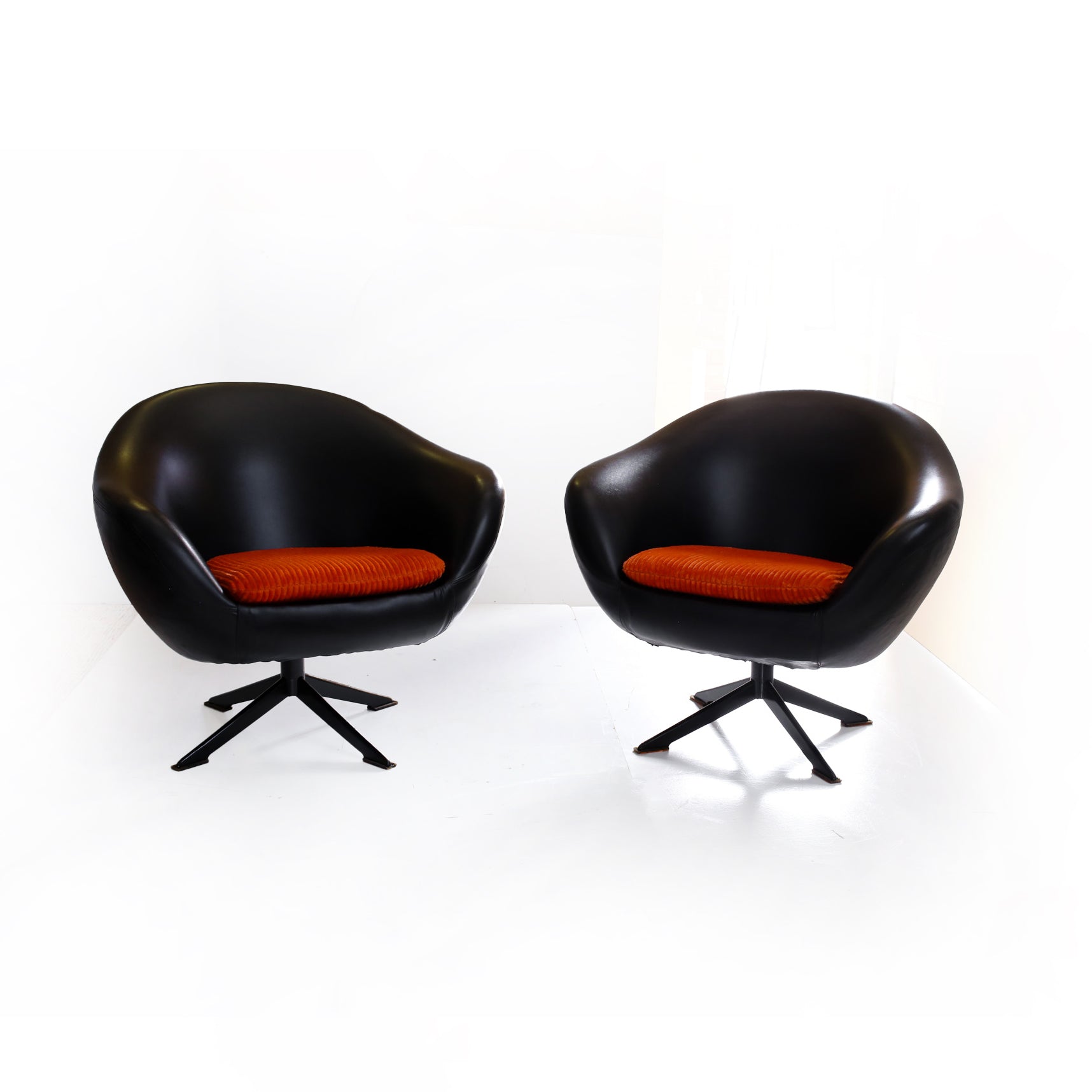 An exquisite pair of 70's Zodiac swivel tub chairs in the original shiny black vinyl, perched on metal star bases. The seat cushions have new covers; the fabric is a bright orange corduroy velvet.