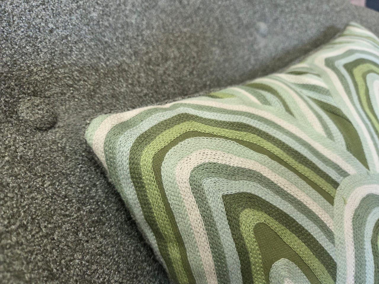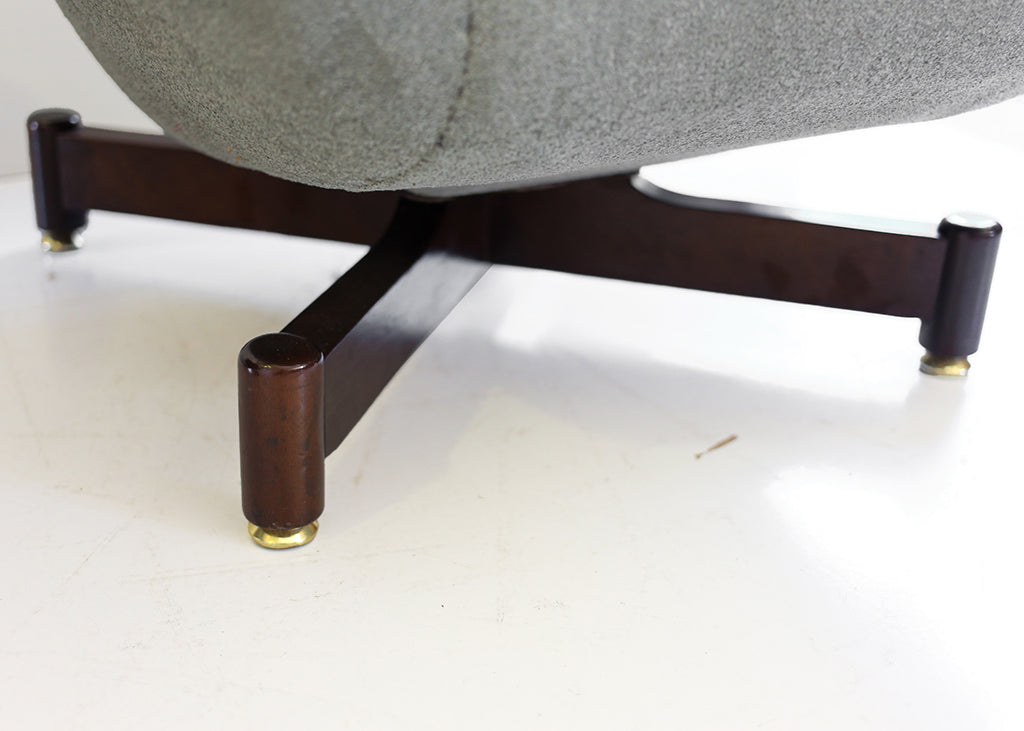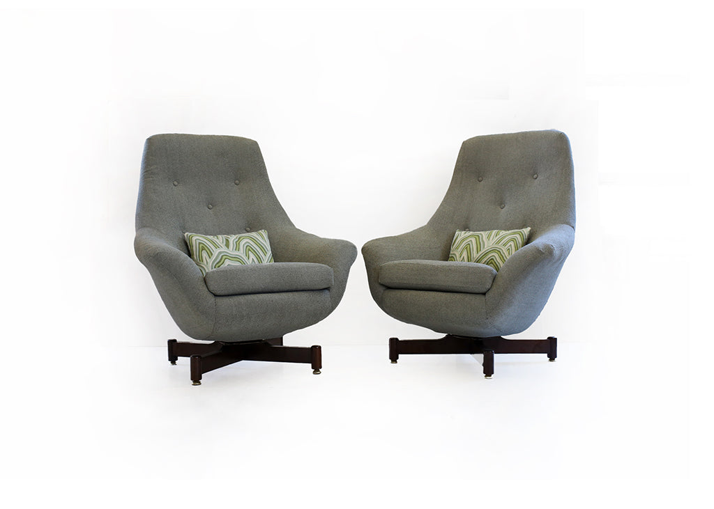 A pair of swivel chairs with sculptural, flared lines on four-spoke wooden bases. They bear the maker's mark of Grafton Everest and the date 1980. The chairs are restored and re-upholstered. The fabric is a quality grey chenille with a hint of green