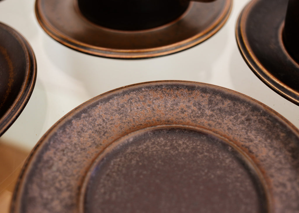 A pristine vintage set of eight cups, sauces and lids from the Ruska series from Arabia (Finland). "Ruska" means "autumn colour" in Finnish, and each piece has a unique, rustic look.