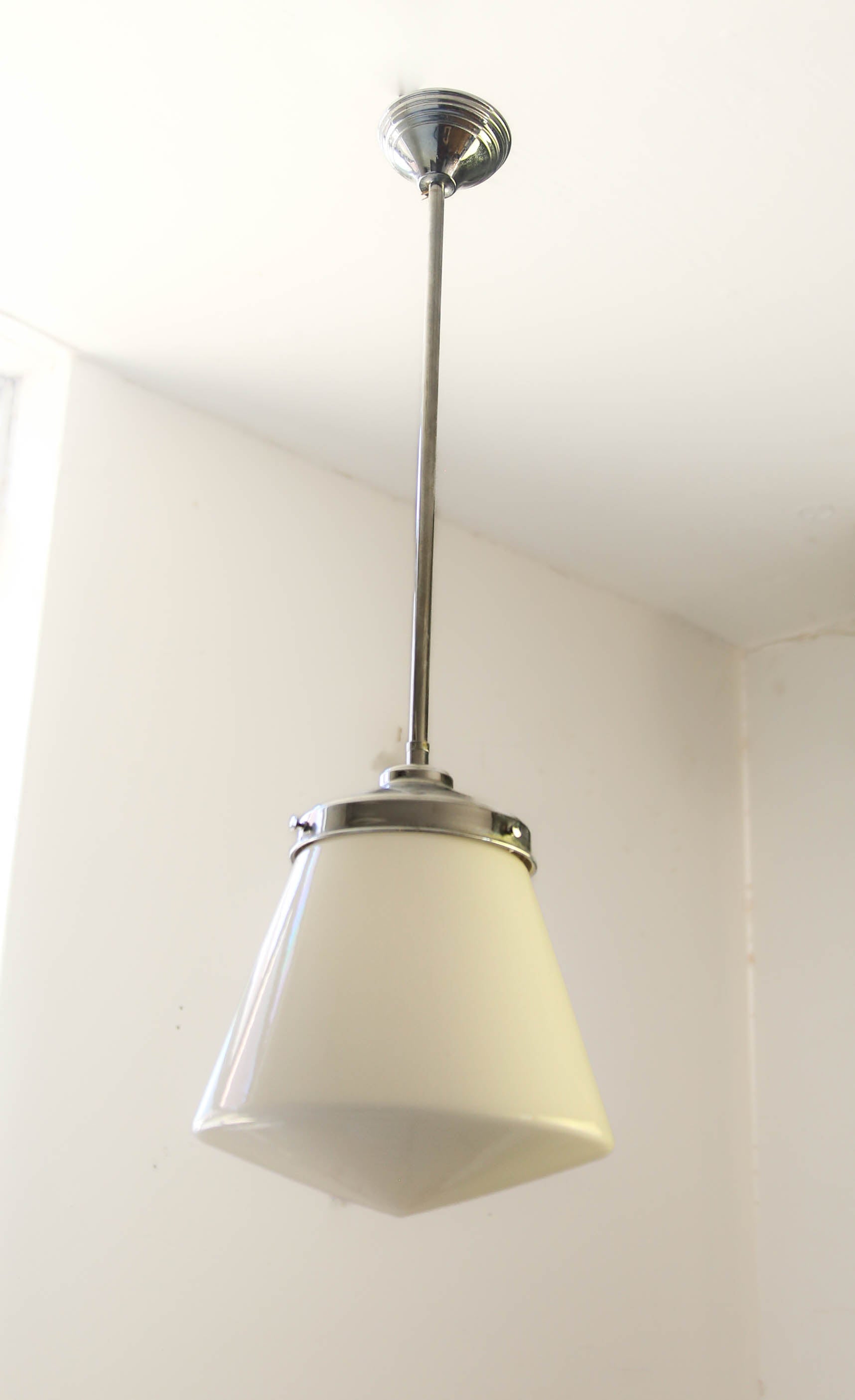 An opal glass ceiling pendant from the Art deco Bauhaus era (1920's). The shade and metal assembly are original from the time.