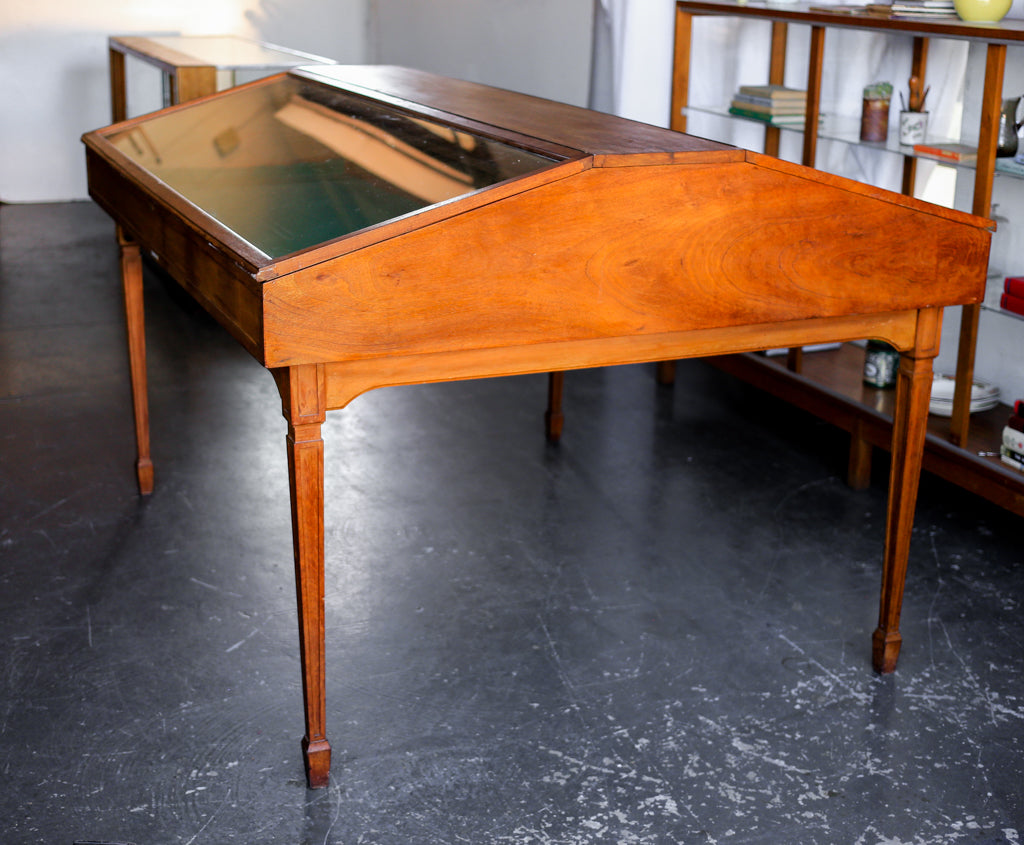 The case has two large display comparments with glass doors that hinge upward. It stands firm on four spade legs. This lovely piece served many decades in a museum, a university library, or a jewelry store.