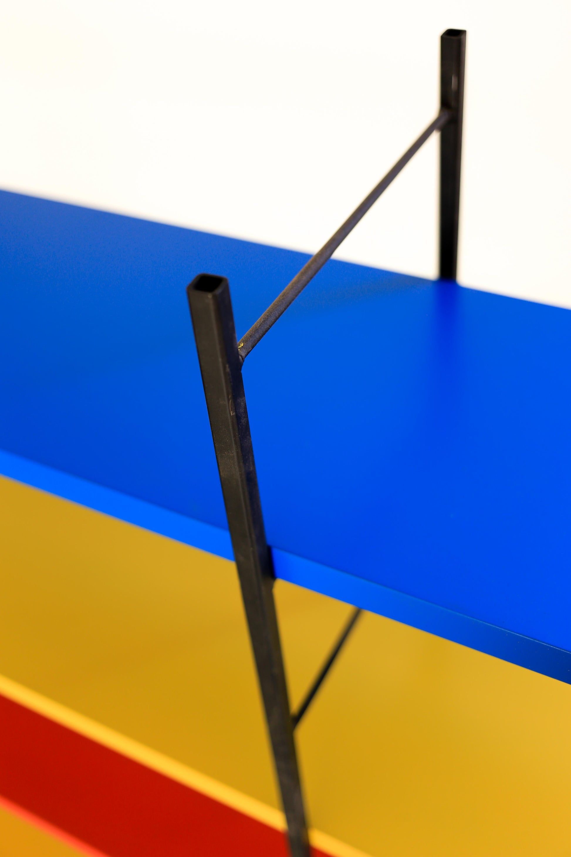 A ladder frame shelf with the frame being authentic restored mid-century steel ladders, and the shelves newly manufactured and spray painted supawood. We decided on primary blue, yellow, and red, as used by Piet Mondrian in his famous modernist painting: "Composition with Red, Blue, and Yellow."