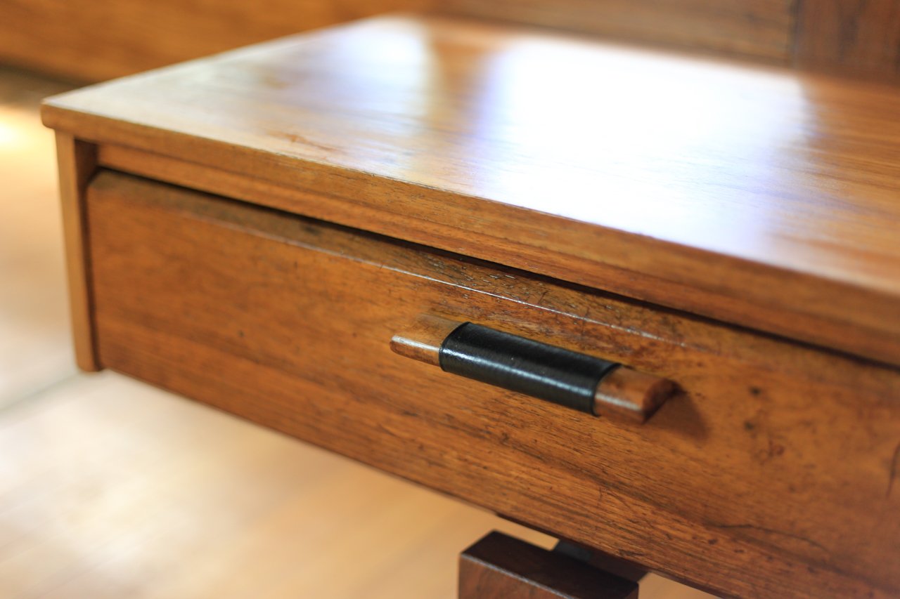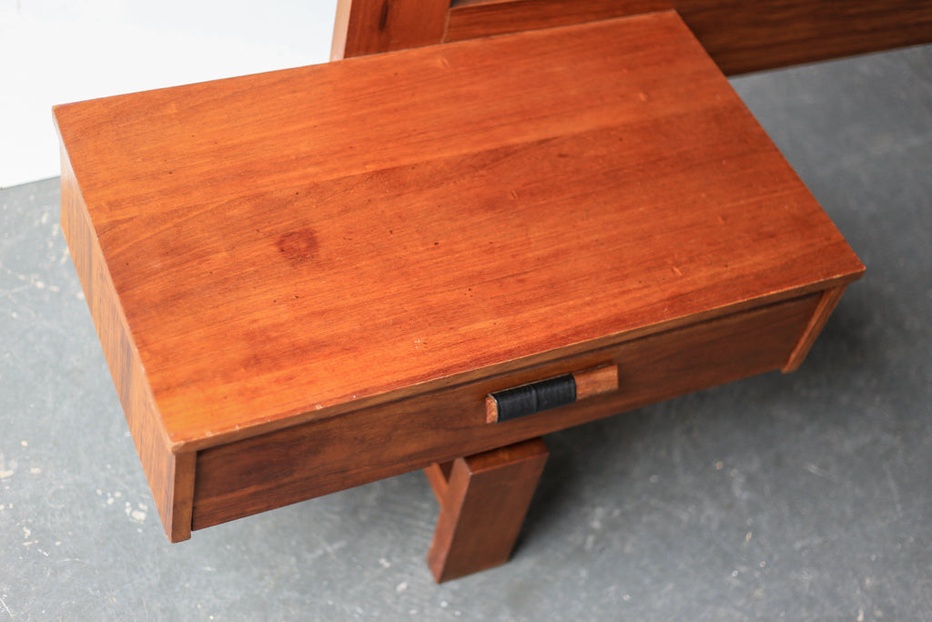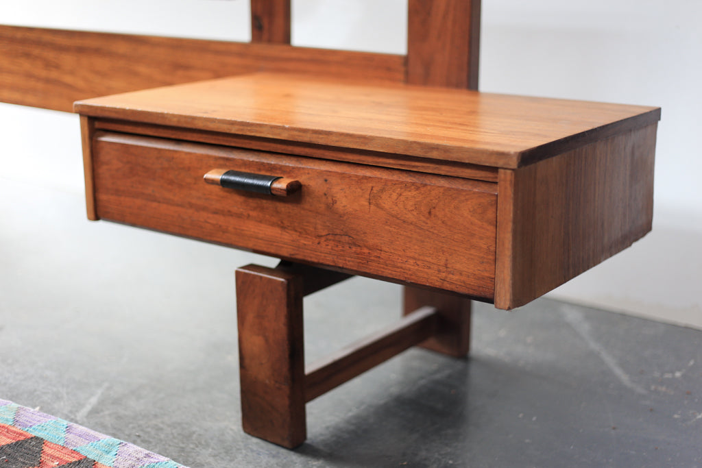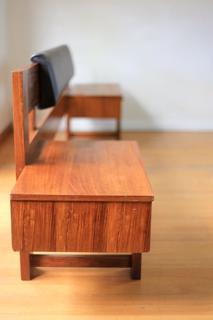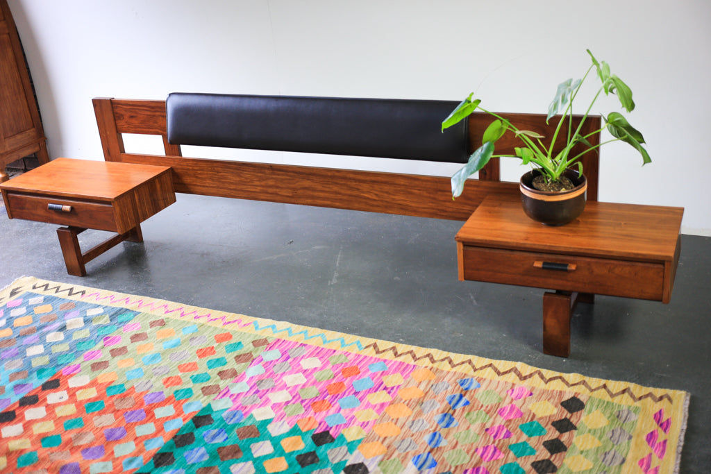 A vintage low headboard with a black padded back and a single drawer pedestal on each side for a queen sized bed. The drawers are wide and low with good looking tops.