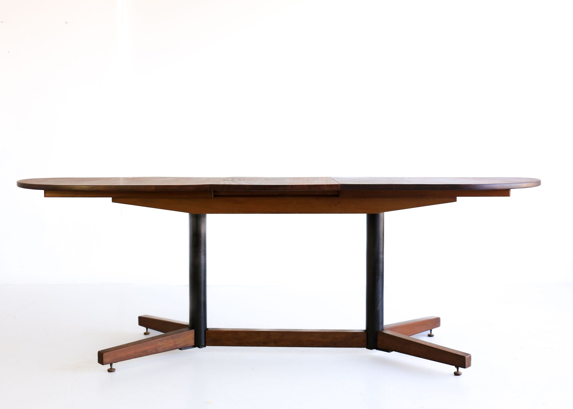 We speculate that it was made by the well-known South African modernist company Kallenbach, but there is no makers mark. The table is narrower than most dining tables and extendable. The steel base is very heavy and sturdy.