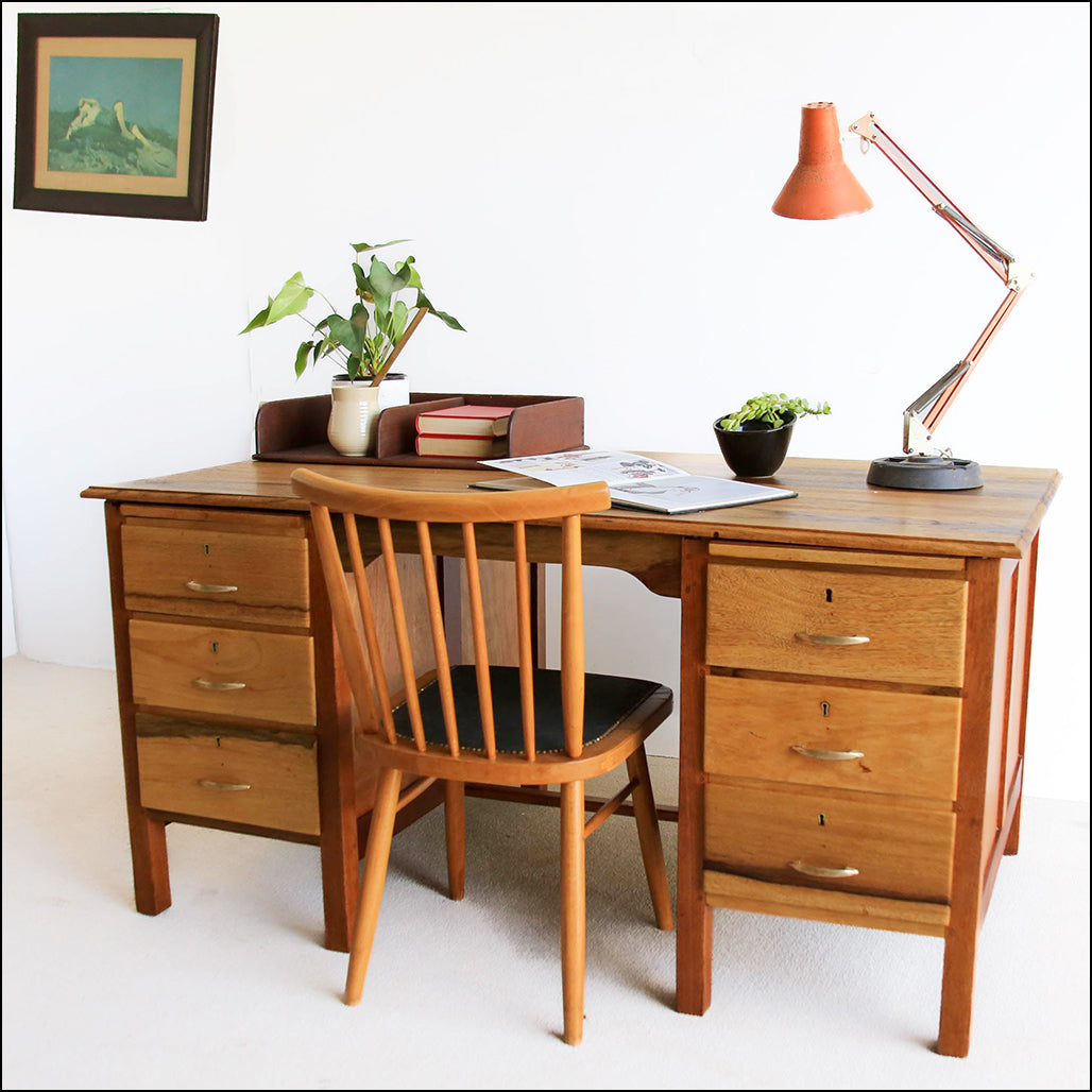 A sturdy vintage desk with six drawers and two sliding panels. The top is solid wood. On top is a two-tray file organiser and the chair is one of a four-piece German mid-century set.