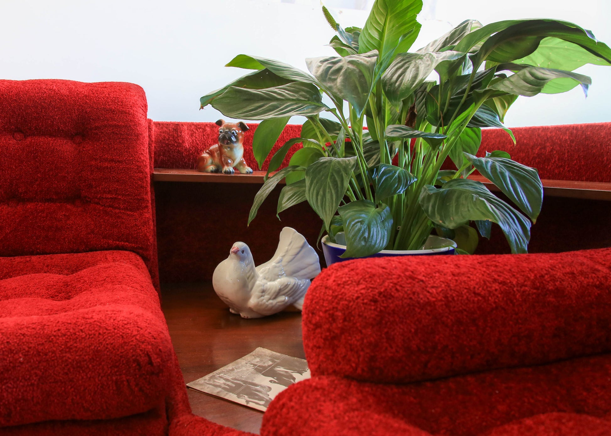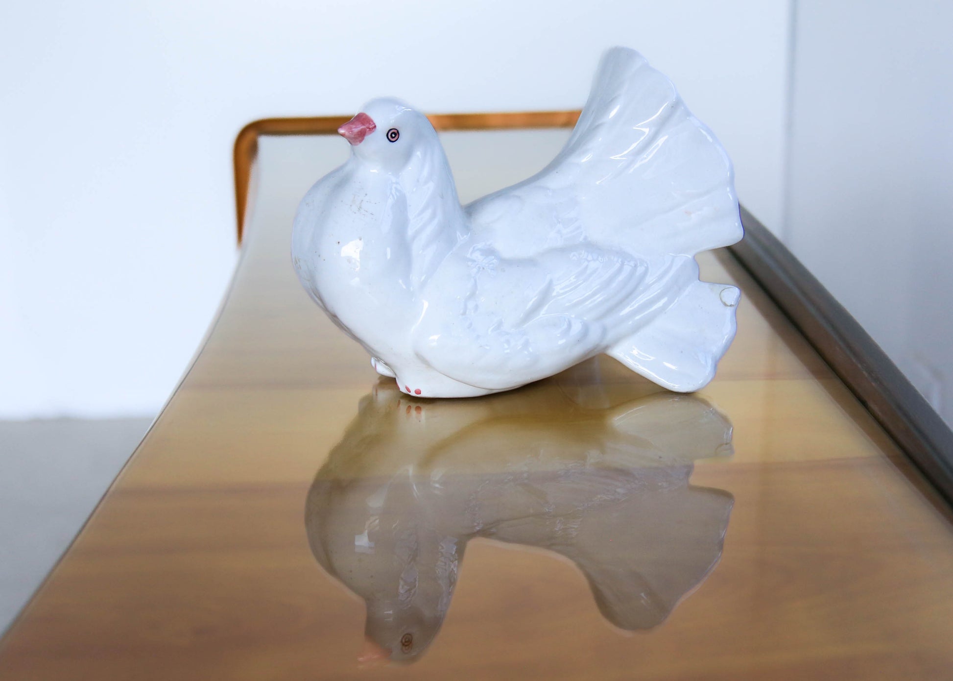 A a white ceramic pigeon statuette from the 1950s. It has a small chip that has been repaired on the tail. It is stamped at the bottom.