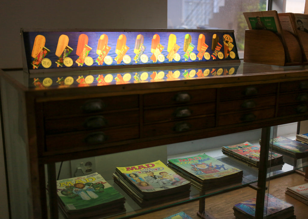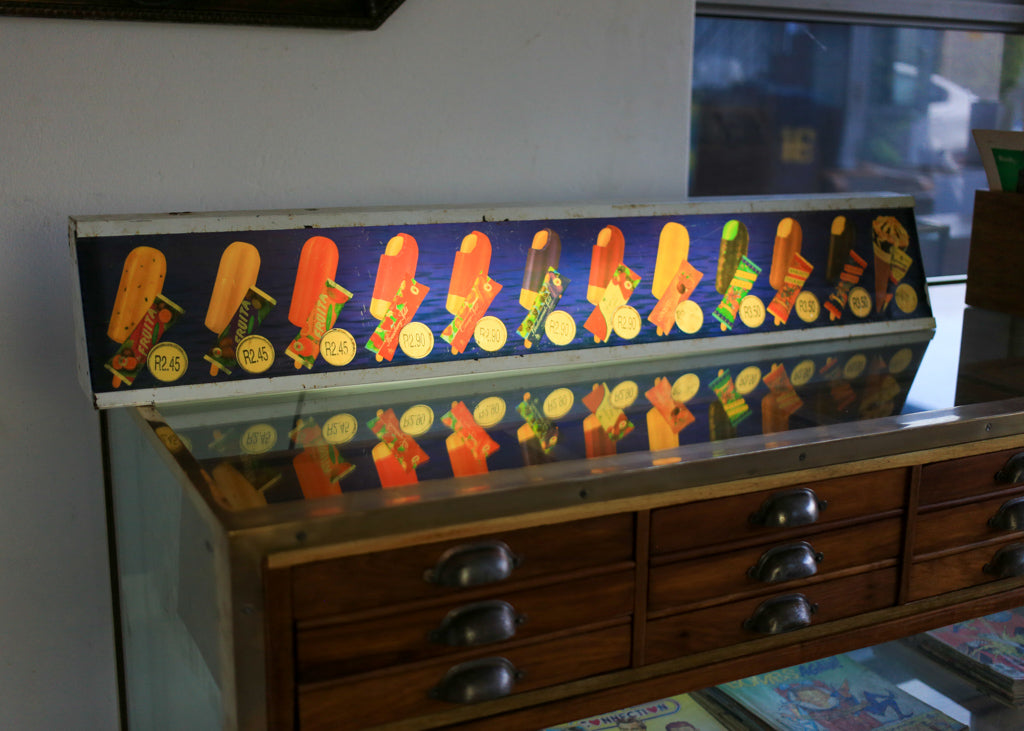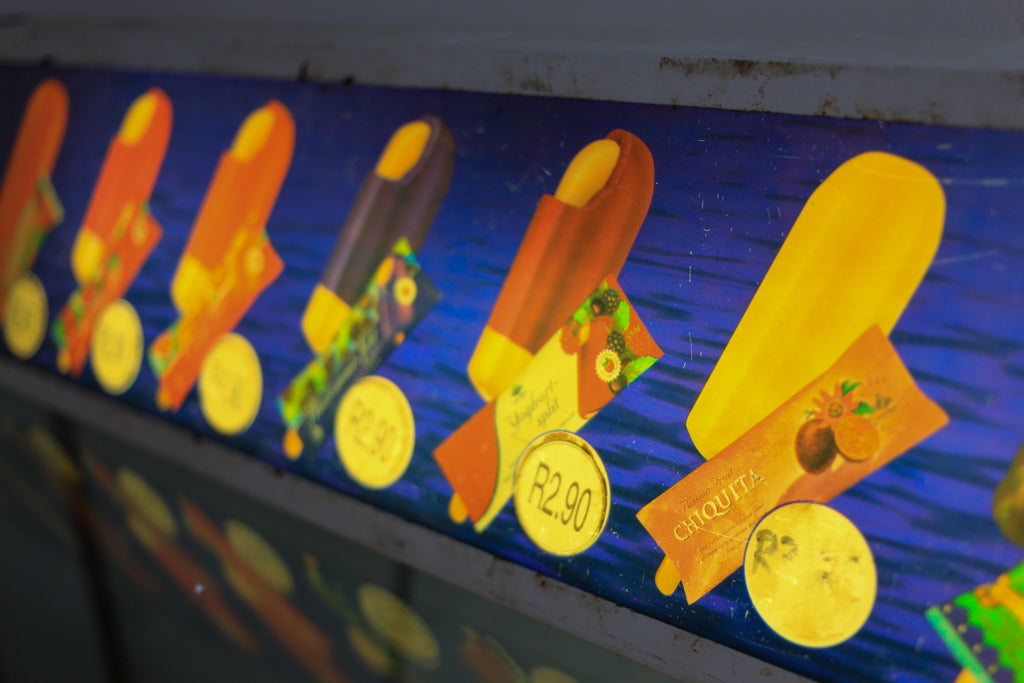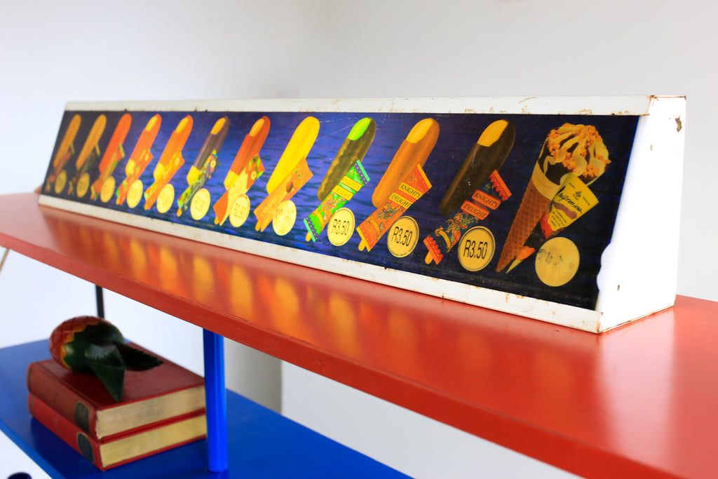 An illuminated ice cream advertising board from the late eighties, judging by die prices of the ice cream.