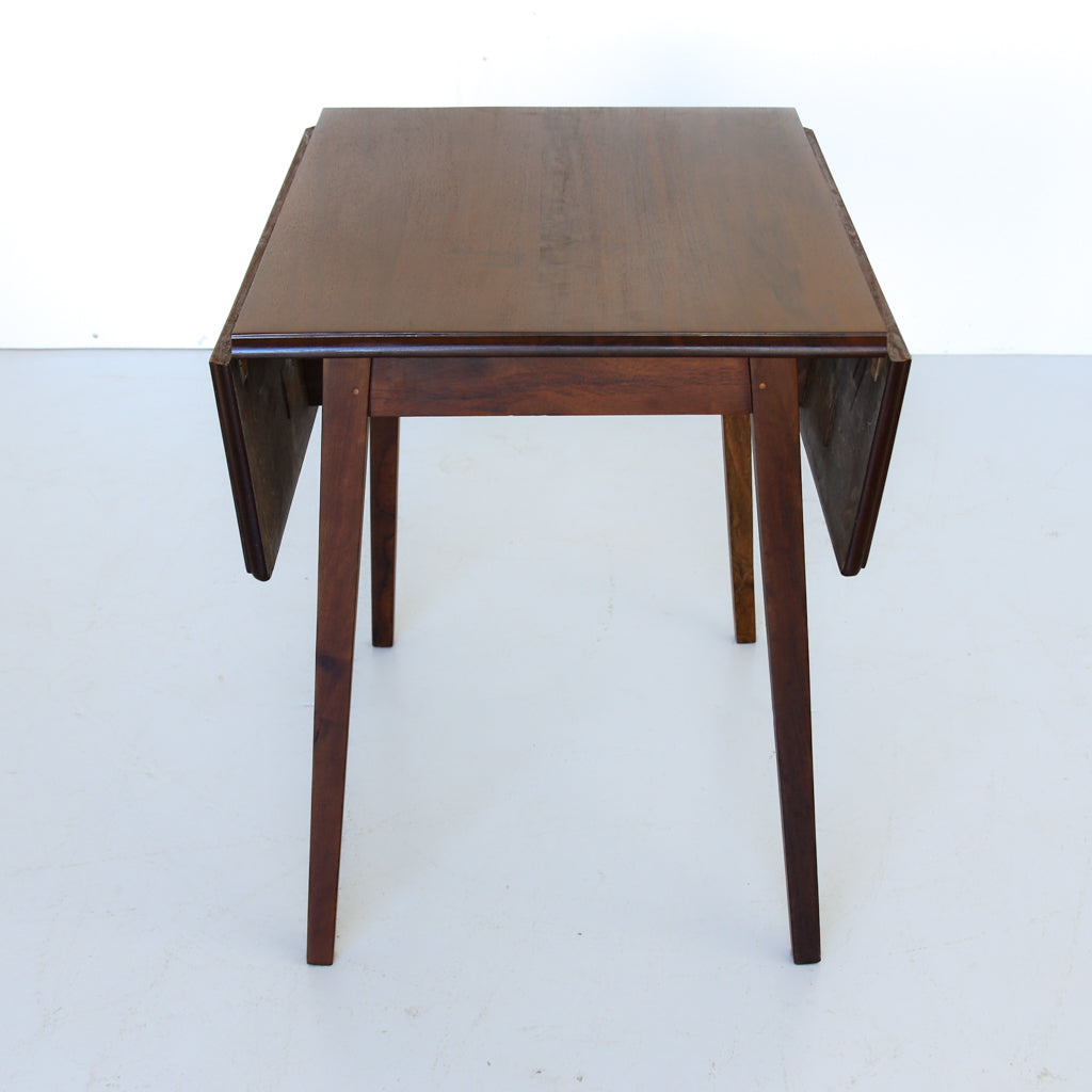 A solid imbuia 1960's drop leaf table in the modernist style with tapered legs. This table is typical from the post-war Scandinavian movement that focused on modular furniture for small apartment spaces. The leafs could be folded down, when not used.
