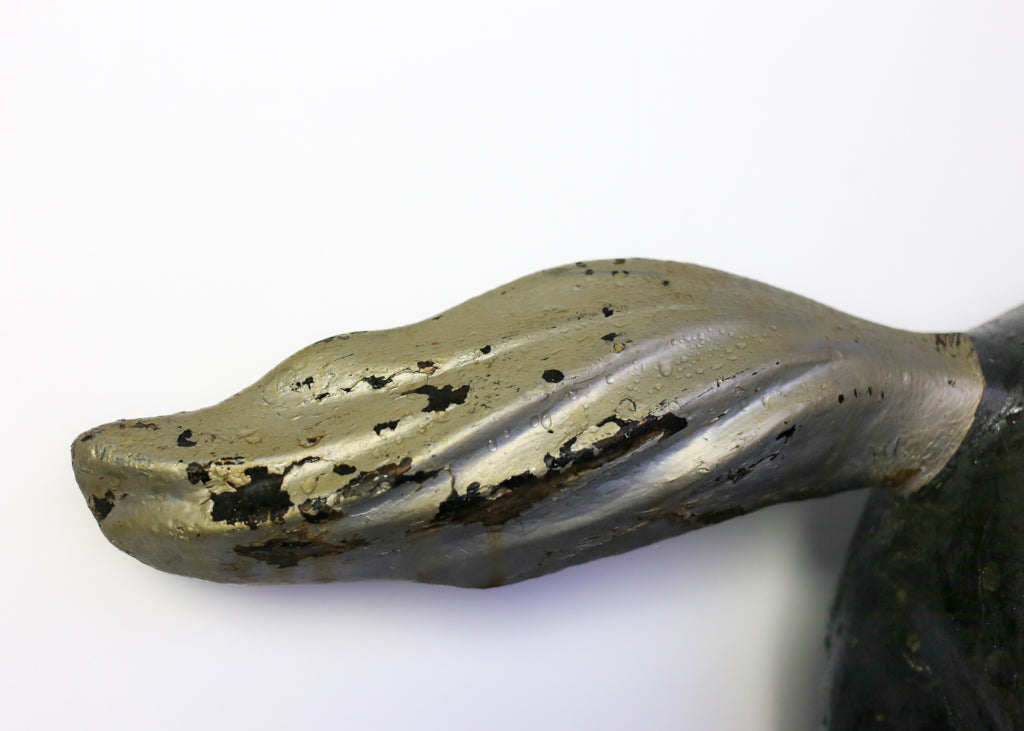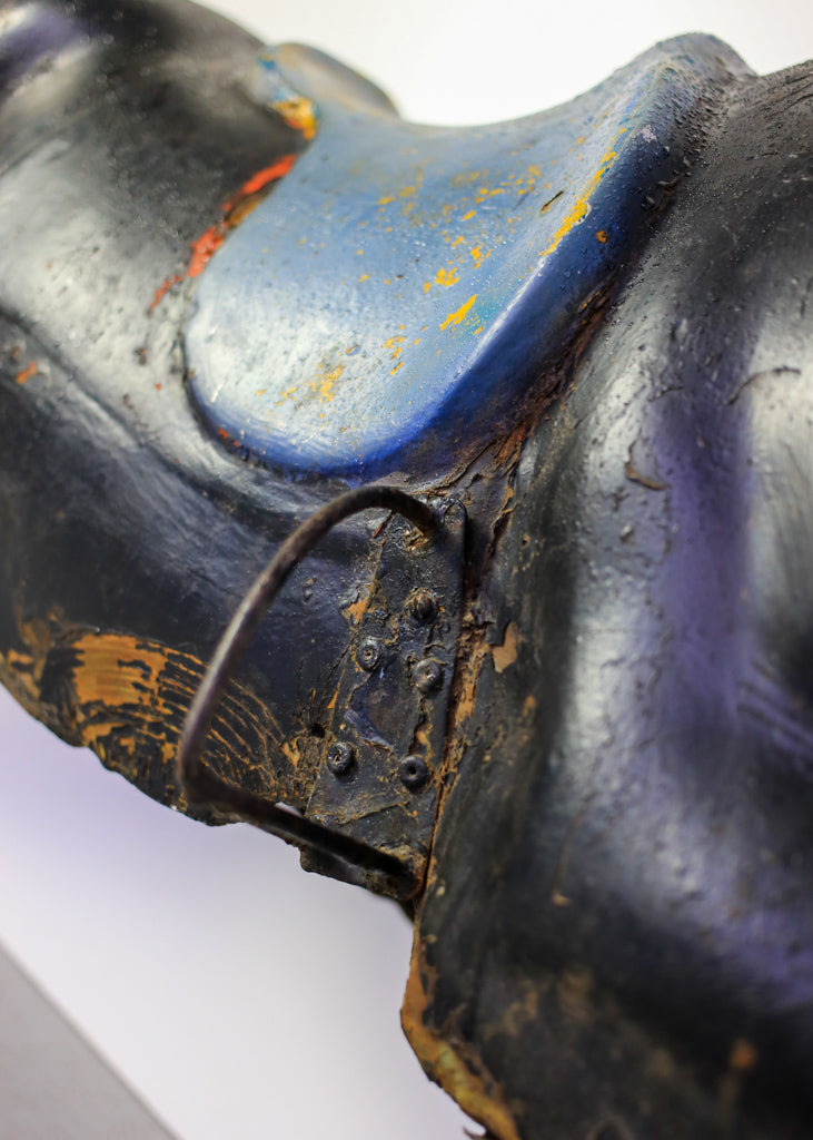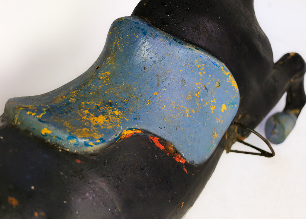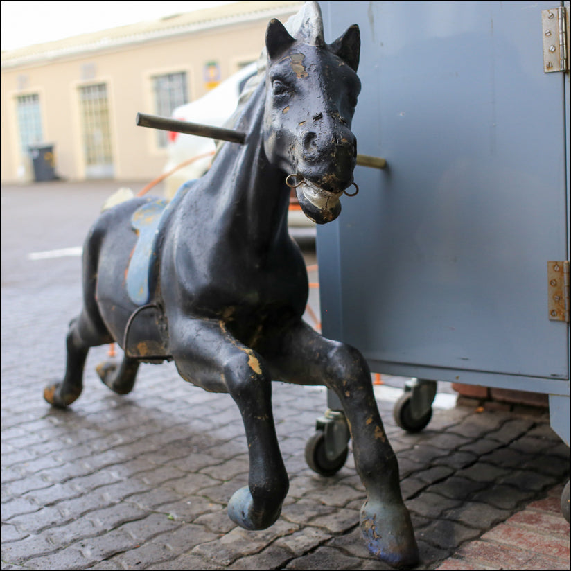 A black carousel pony made with fibre glass in the 1950's or 1960's - it can even be older. It comes with all the beatings that a 70-year-old mare that's been dragged all over the country would show - dings and tears and many layers of paint. Look at the pictures.